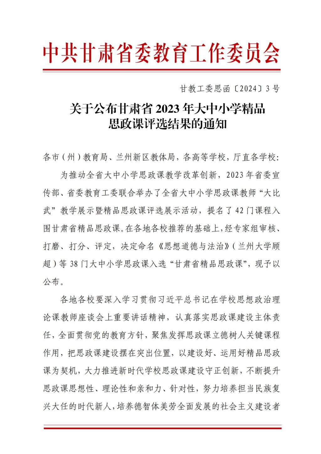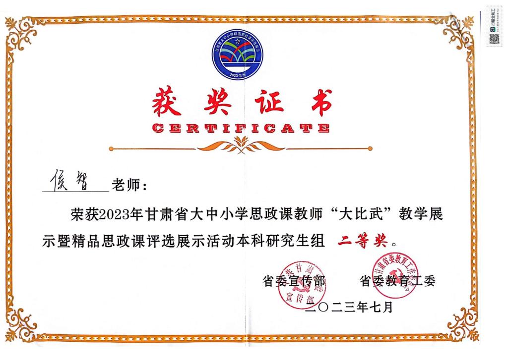 bat365正版唯一官网教师侯智在甘肃省2023年大中小学精品思政课评选中获奖