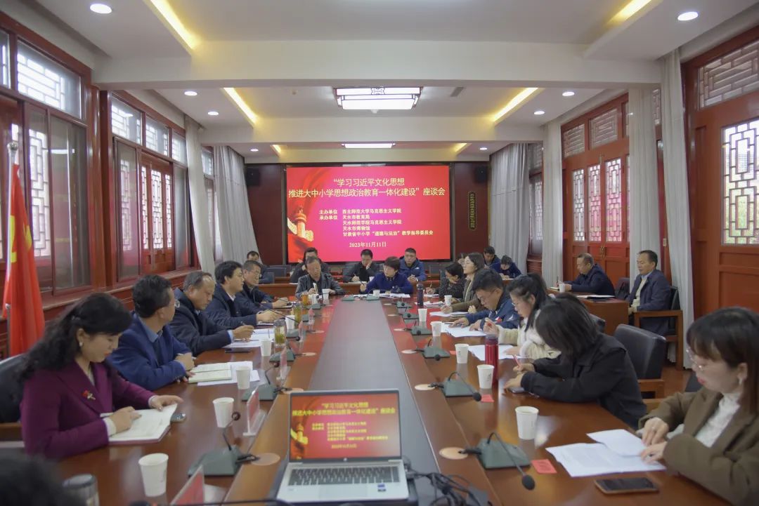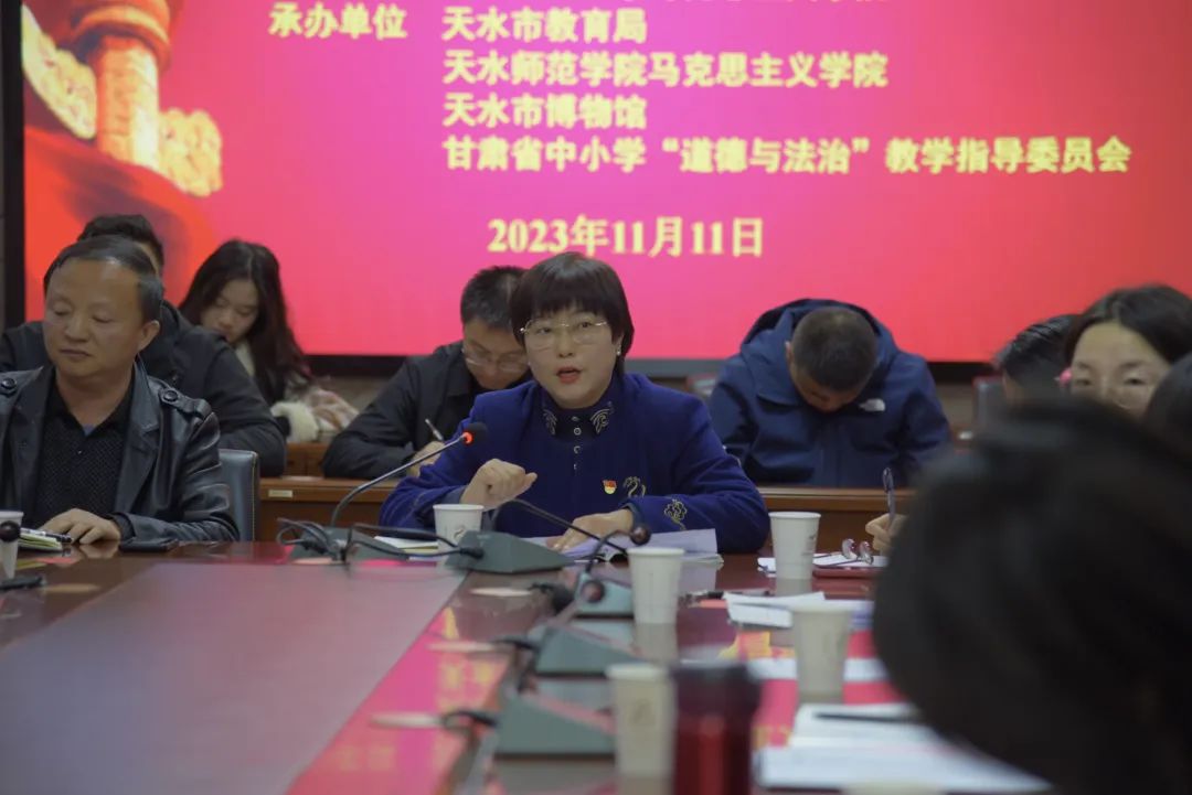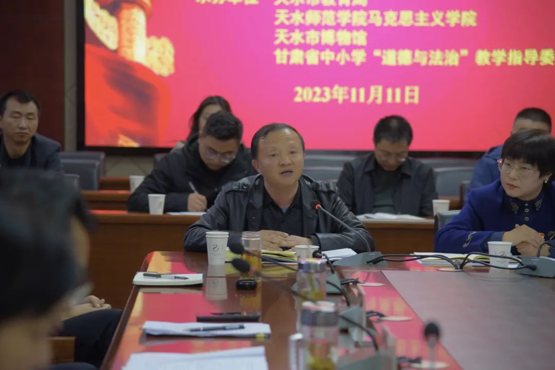 11月11日下午,由西北师范大学bat365正版唯一官网、天水市教育局、天水师范学院bat365正版唯一官网、天水市博物馆、甘肃省中小学“道德与法治”教学指导委员会共同举办的“学习习近平文化思想 推进大中小学思想政治教育一体化建设”座谈会在天水市博物馆畅和轩会议室隆重召开。西北师范大学bat365正版唯一官网党委书记刘德雄、院长史小宁、党委副书记王宏渊,天水师范学院bat365正版唯一官网党委书记刘建军,天水市教育局党组成员、总督学张永蔚,天水市博物馆党总支副书记、副馆长崔文刚等领导参加会议。