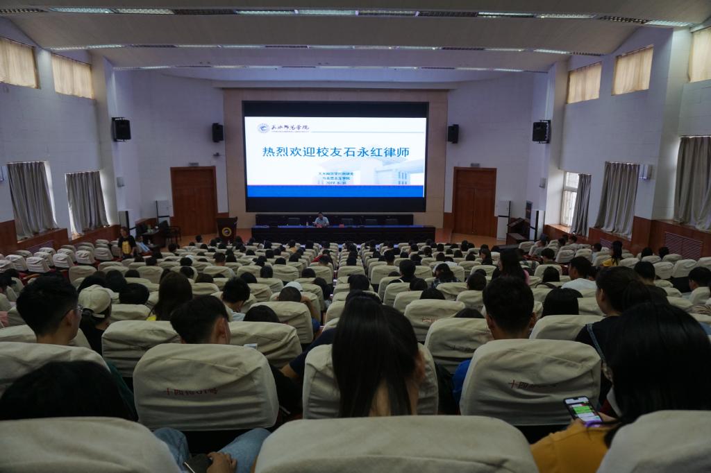 石永红律师以“以梦为马,远方可期”为题,回顾了自己坚守梦想,不懈打拼,从一名农村家庭的孩子从母校一步步走向社会,成为一名陇南地区的知名律师的人生经历,给在场学生以榜样和启迪,他说“有目标并且要付出努力;给自己定目标的时候要符合自身的条件;无论什么时候人在奋斗中都不要轻易满足;保持良好的心态,成为一个身心健康的人;学会交流、沟通、协作,发扬团队精神,补短板,扬长板;严于律己,宽以待人,用宽容的心对待别人,给自己和别人留一些余地。”石永红律师的经历激发了思政和法学学生的专业自信,使学生们在职业发展的道路上受益匪浅。石永红律师还面对面进行交流互动,对同学们提出的一些问题当场做了解答。