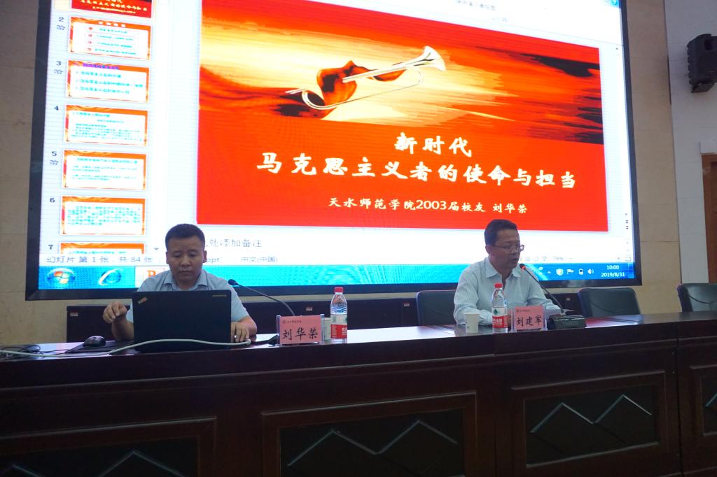 刘建军代表学院首先对石永红律师和刘华荣博士的校友返校表示热烈的欢迎。石永红律师在1999—2002年在天水师范学院政史系政治教育专业学习,2006年9月通过全国司法考试,2007年2月取得律师执业证,先后在陇南康达律师事务所、陇南永盛律师事务所执业,2018年3月创办了甘肃陇一律师事务所;刘华荣博士在2000——2003年在天水师范学院政史系政治教育专业学习,2008年—2011年在兰州大学政治与行政学院攻读国际政治专业研究生,2011年—2014年在兰州大学bat365正版唯一官网攻读博士研究生,现为兰州交通大学bat365正版唯一官网副教授,硕士生导师。