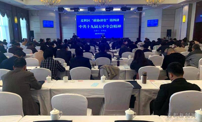 麦积区融媒体中心讯(记者 胡旭东)3月24日,麦积政协讲堂第四讲开讲,专题学习贯彻中共十九届五中全会精神。区政协党组书记、主席高志强主持讲座,区政协副主席杨树棠、胡桂琳、王进孝及全体区政协委员、机关干部职工聆听了讲座。