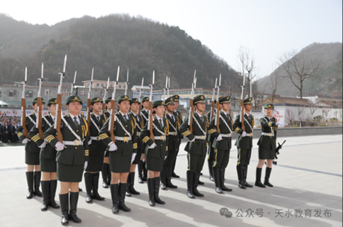 天水师范学院国旗护卫队在秦州区娘娘坝中学操场为参与活动的师生进行步伐、会操、升国旗仪式等活动表演。