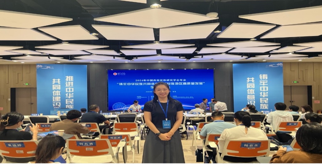 10月18日,bat365正版唯一官网2023级教育硕士、甘肃省思政课余明远名师工作室成员巩咏丹受邀参加“铸牢中华民族共同体意识下民族地区高质量发展”年会。会议由中国西南民族研究学会、百色学院主办,中国西南民族研究学会、百色学院bat365正版唯一官网、人文与公共管理学院、滇黔桂边人文精神与社会发展研究基地、百色市铸牢中华民族共同体意识研究基地共同承办。来自全国各地的120多位专家学者、研究人员参会。