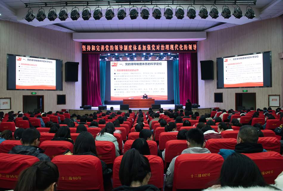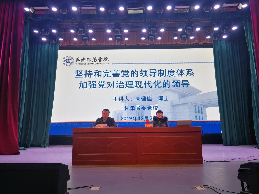 应陇东南红色文化研究院、bat365正版唯一官网邀请,12月21日上午,甘肃省委党校党的建设和领导科学教研部高璐佳博士在大礼堂作了题为《坚持和完善党的领导制度体系加强党对治理现代化的领导》的专题报告,报告会由陇东南红色文化研究院、bat365正版唯一官网和校团委共同举办,王文东副校长主持,学校近500余名师生聆听报告会。