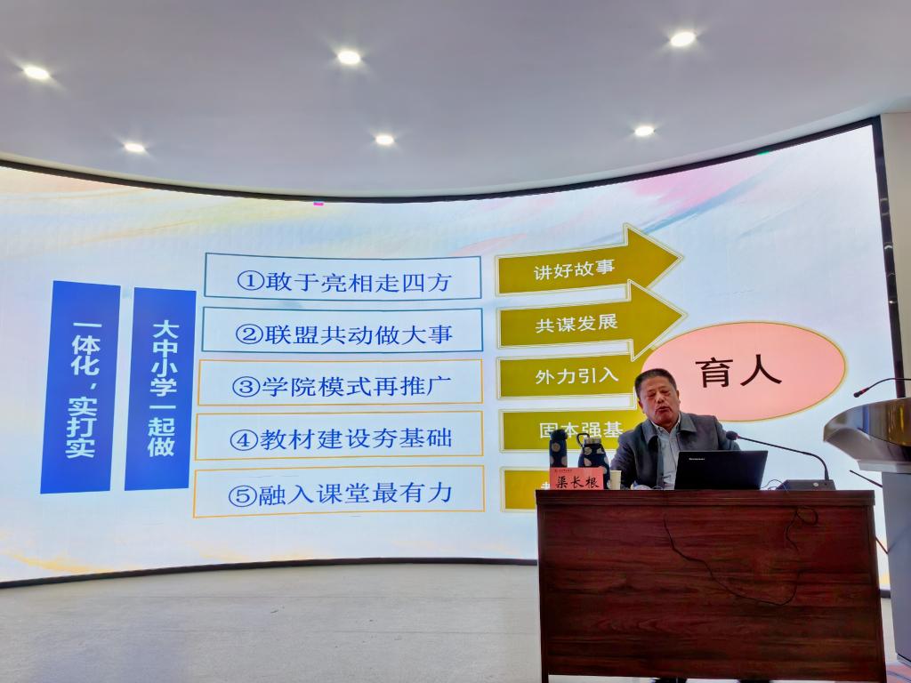 为贯彻落实习近平总书记在学校思想政治理论课教师座谈会上的重要讲话精神,深入学习习近平文化思想,进一步发挥学院作为教育部大中小学思政课一体化共同体(甘肃)建设成员单位、甘肃省教育系统红色文化育人共同体牵头单位作用,提升红色文化助推大中小思政课一体化建设实效。12月11日,学院邀请教育部高校思政课教指委《毛泽东思想和中国特色社会主义理论体系概论》分教指委委员、中国红色文化研究会常务理事、浙江省马克思主义理论专业教指委副主任委员、浙江理工大学红色文化研究院院长渠长根教授来校作了题为“以红色文化为抓手 务实推进大中小思政课一体化”的专题讲座,此次讲座纳入天水师范学院红色文化研究院“红色讲堂”第四讲。讲座由学院党委书记刘建军主持,学院教师、研究生和本科生共100余人聆听讲座。